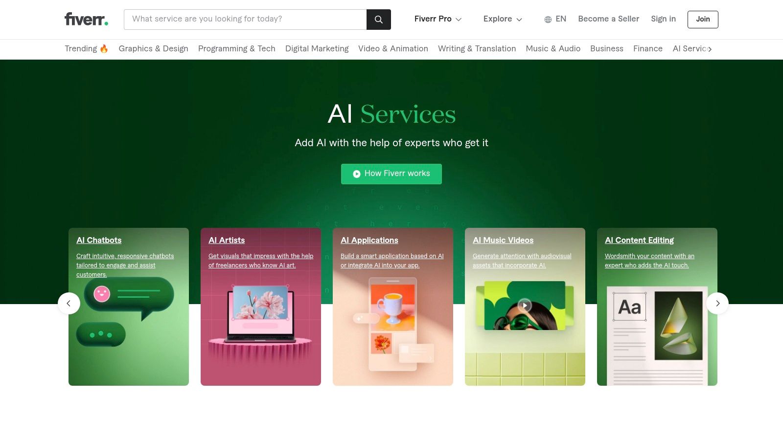 For small businesses that need human expertise to harness the power of Sora 2 video generation, Fiverr's AI Services hub is a game-changer. Instead of a tool, Fiverr is a marketplace to hire freelance talent for specific AI video projects. This is perfect for businesses needing custom videos created with advanced models without the overhead of hiring a full-time video editor or AI specialist.